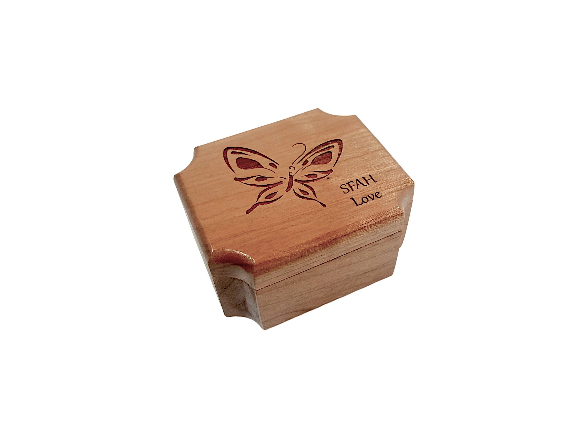All of our ring boxes are made from premium hardwood, no plywood or pressboard! The design shown in the photos will be engraved along with your custom text. We do not stain or paint any of our urns but apply several finishing coats of lacquer to show off the beautiful natural wood grain.