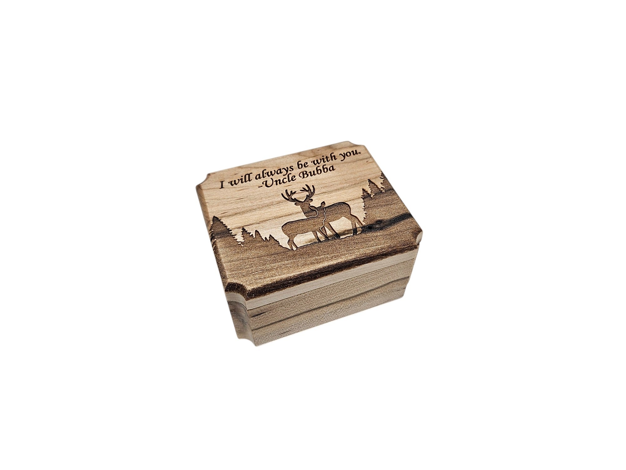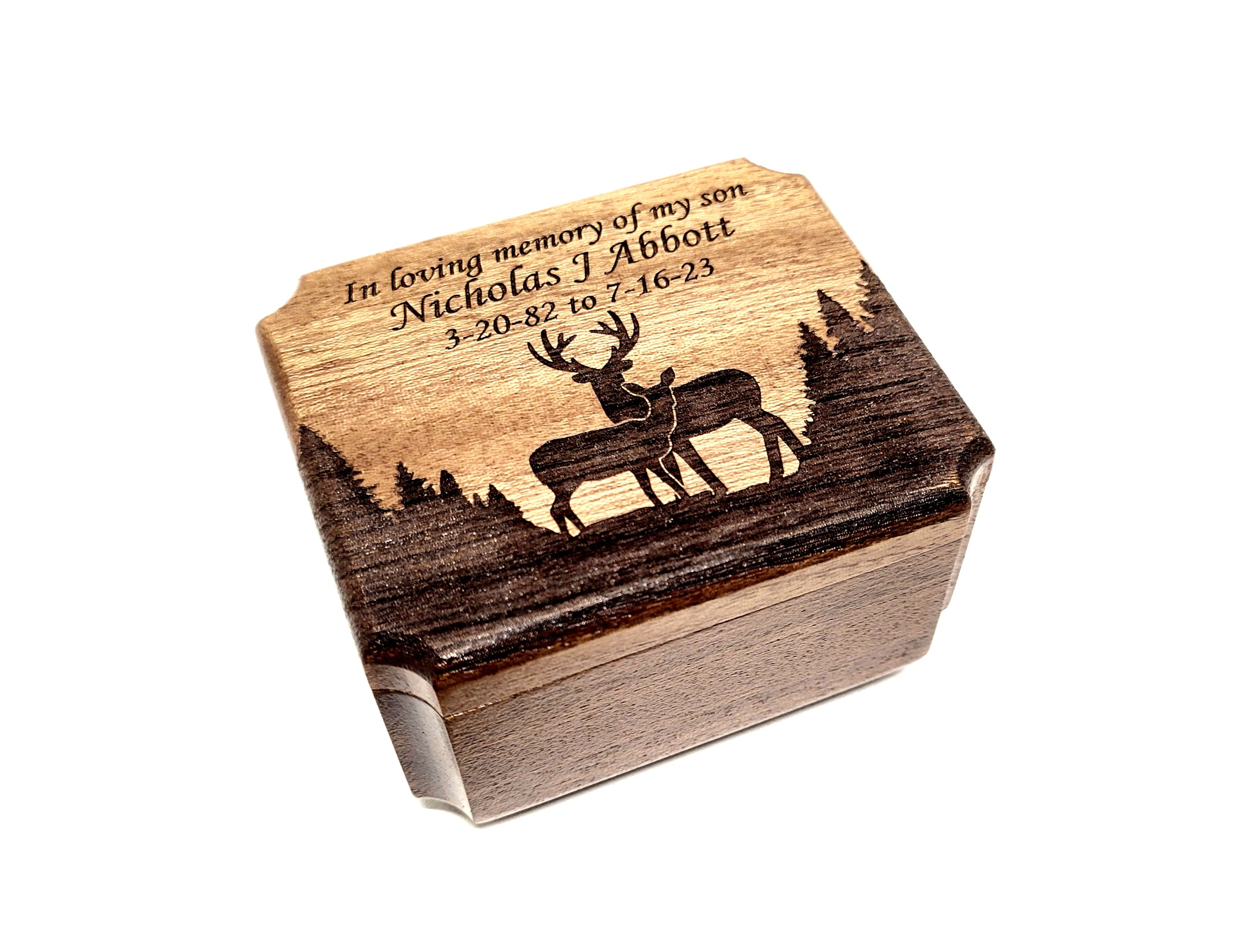 All of our ring boxes are made from premium hardwood, no plywood or pressboard! The design shown in the photos will be engraved along with your custom text. We do not stain or paint any of our urns but apply several finishing coats of lacquer to show off the beautiful natural wood grain.