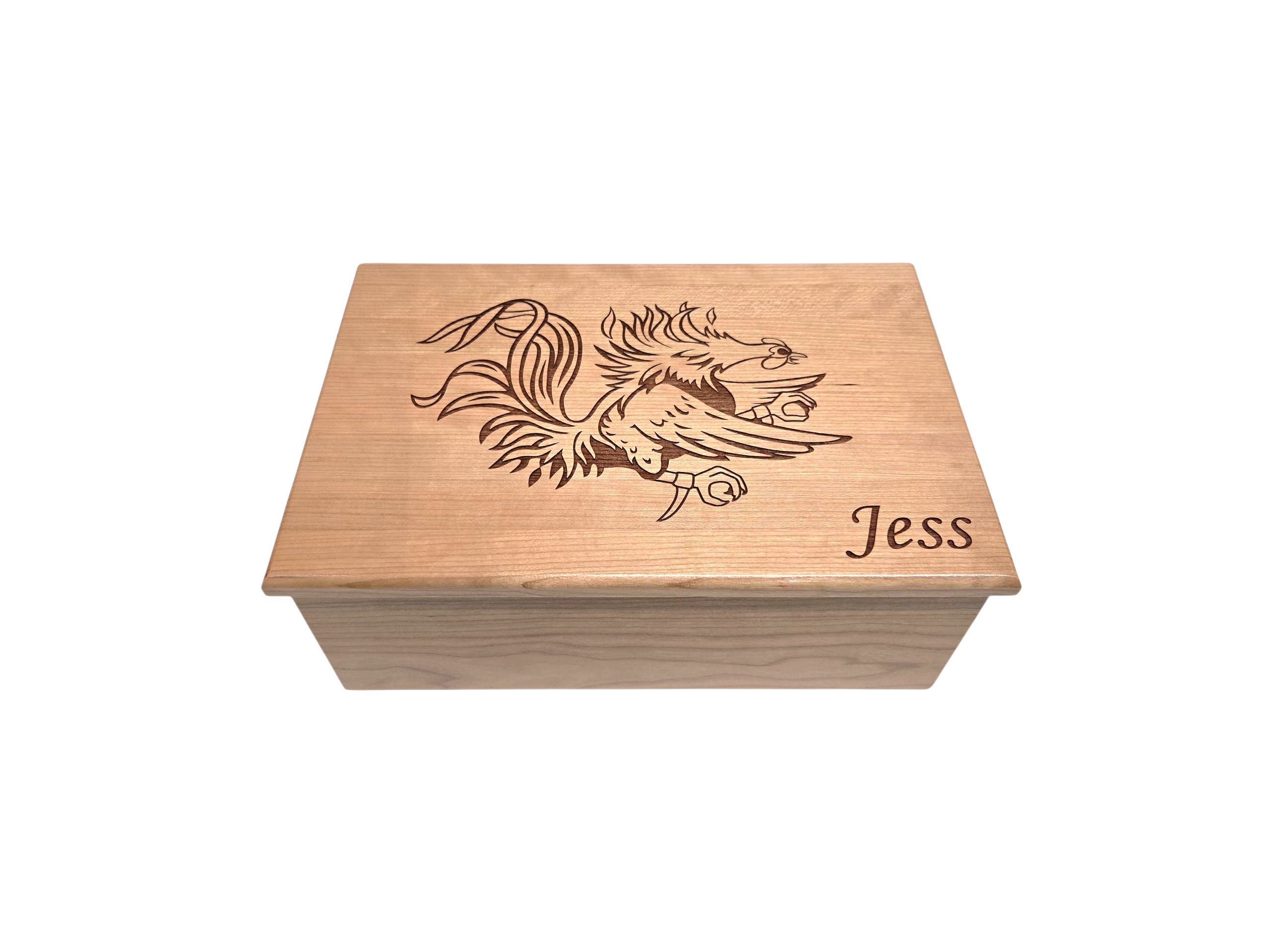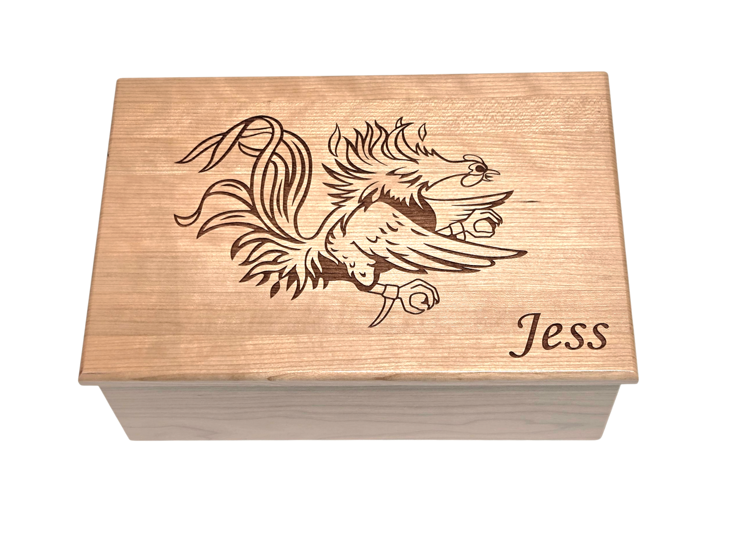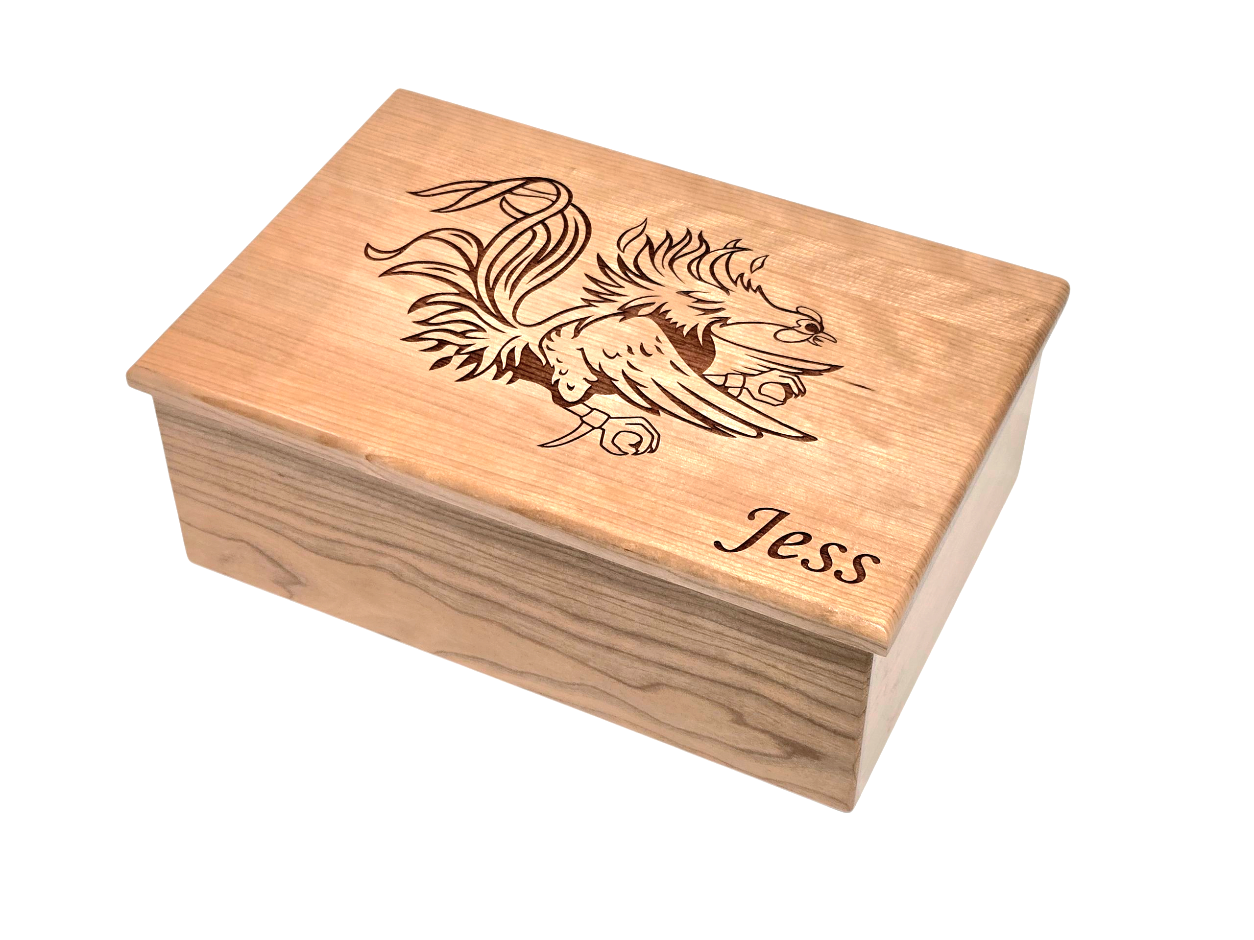 - From the drop-down boxes, choose your engraving option. The top of your box will be engraved with the design shown in the first photo and your custom text. If you choose to add engraving on the inside lid of your box, the inside lid will be engraved with your custom text. In the box provided, note the text you would like engraved on the top of your box to go along with the design. If you chose to engrave both the top and inside lid, please note the text you would like for the inside lid in the box below as well. (We do not have a specific limit on number of characters, but keep in mind that the more characters you have, the smaller the font will be.) Please be sure to double-check all spelling and capitalization as we will engrave it EXACTLY as you have noted.