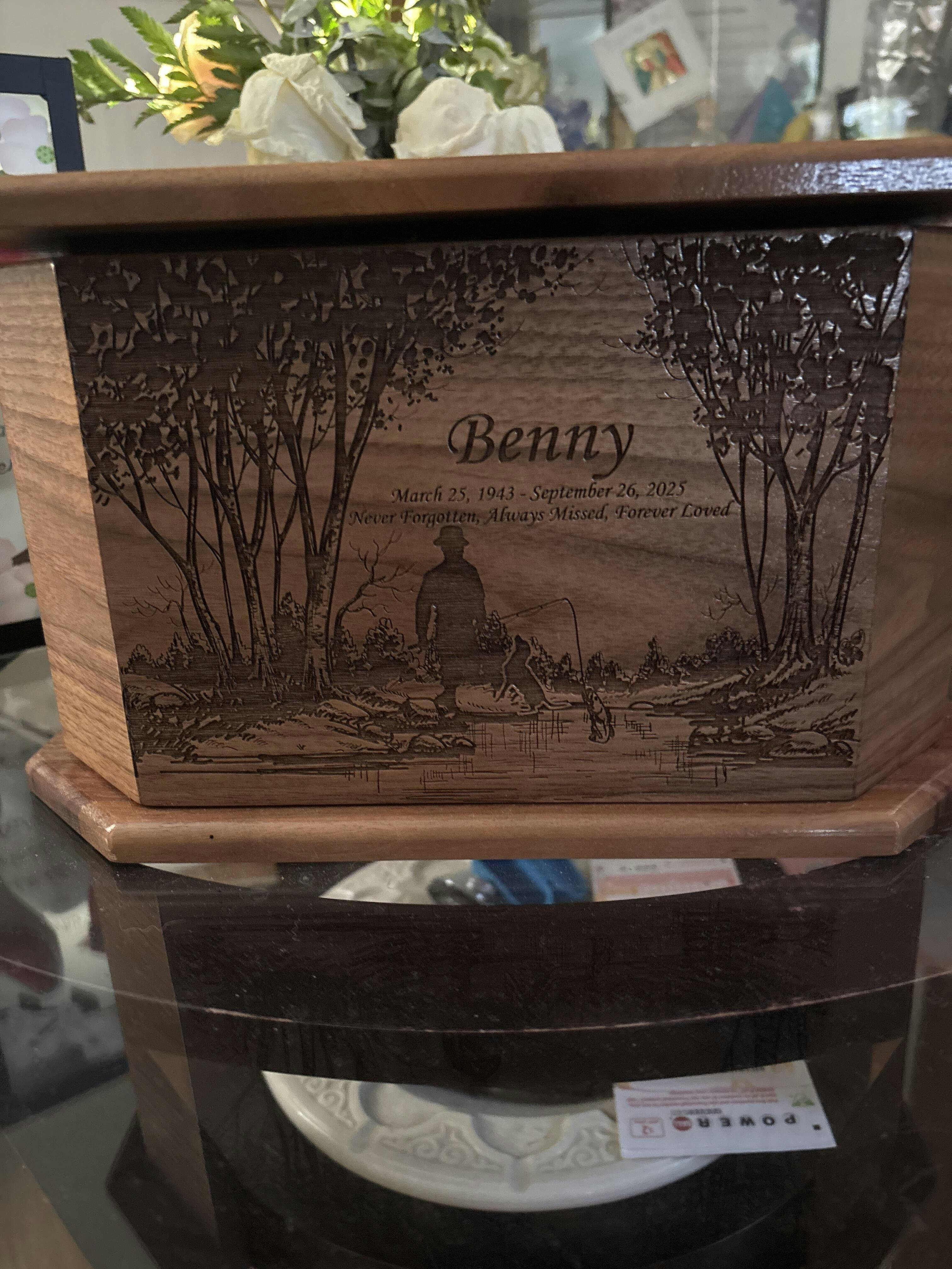 Man Fishing at Pond in Woods Urn Add Text, Personalized Handmade Custom Wood Laser Engraved Memorial Urn