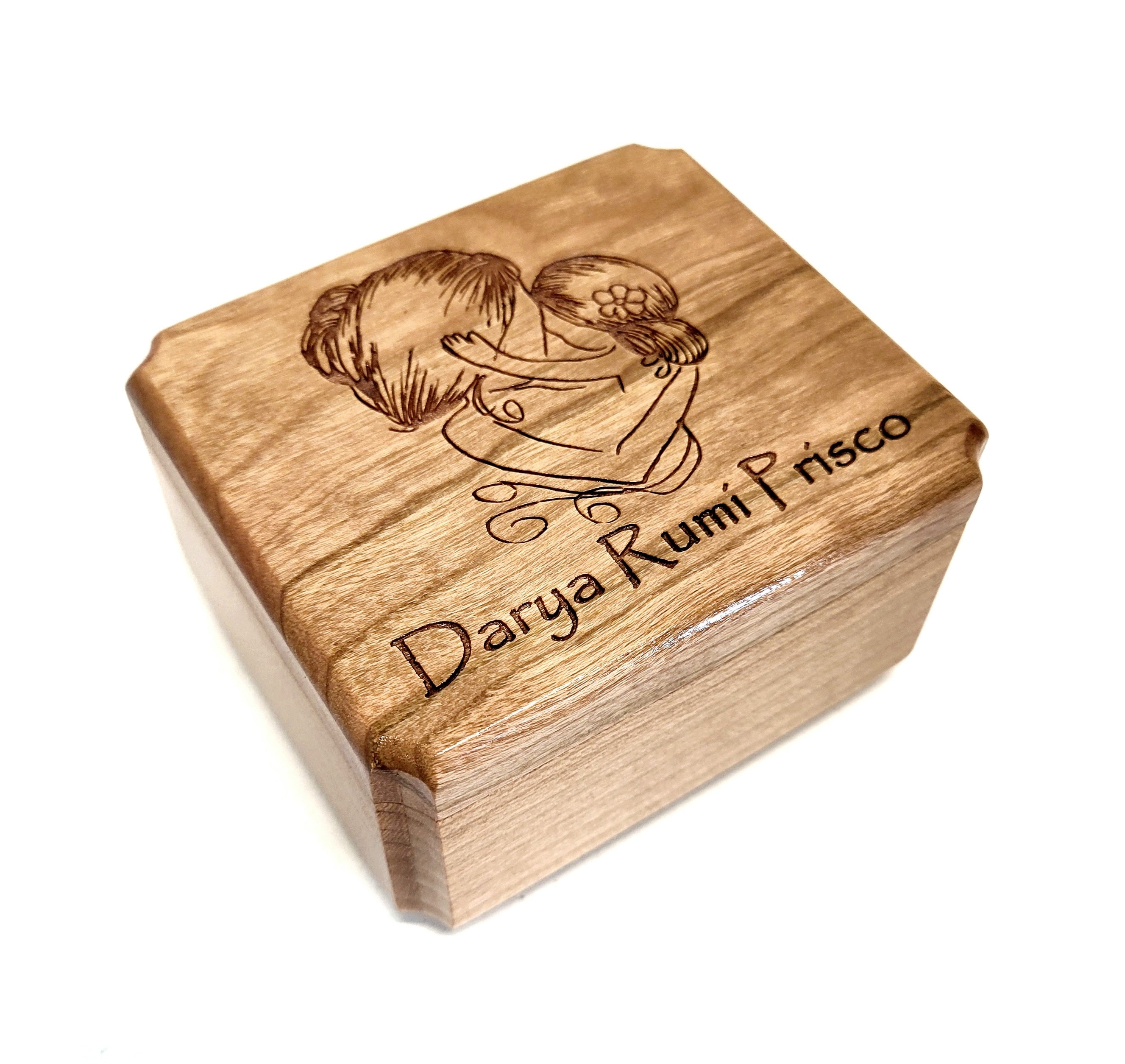 All of our ring boxes are made from premium hardwood, no plywood or pressboard! The design shown in the photos will be engraved along with your custom text. We do not stain or paint any of our urns but apply several finishing coats of lacquer to show off the beautiful natural wood grain.