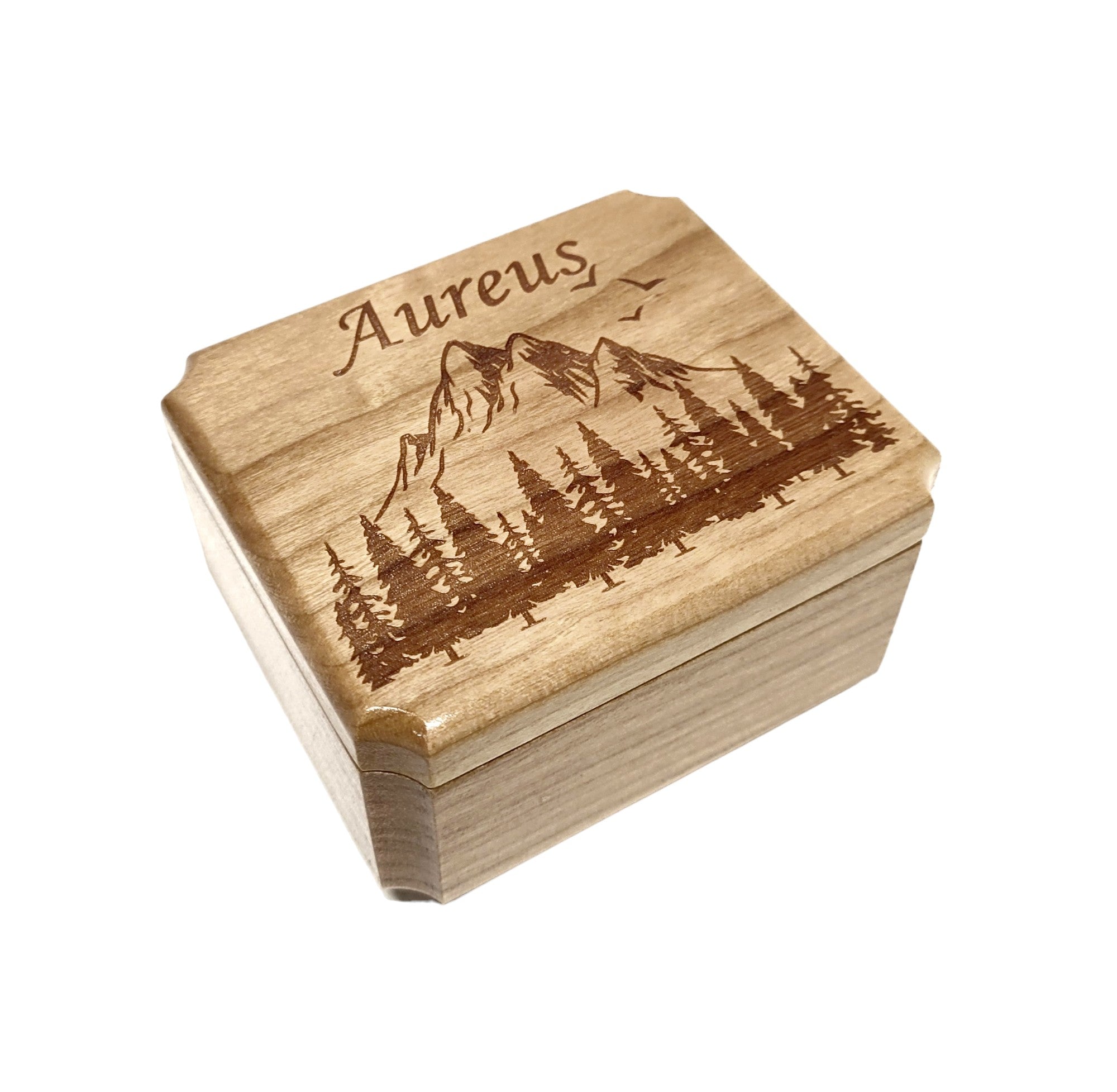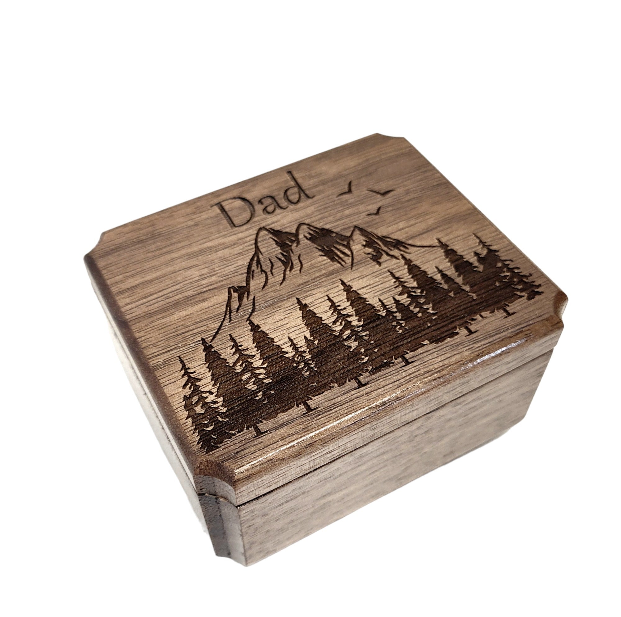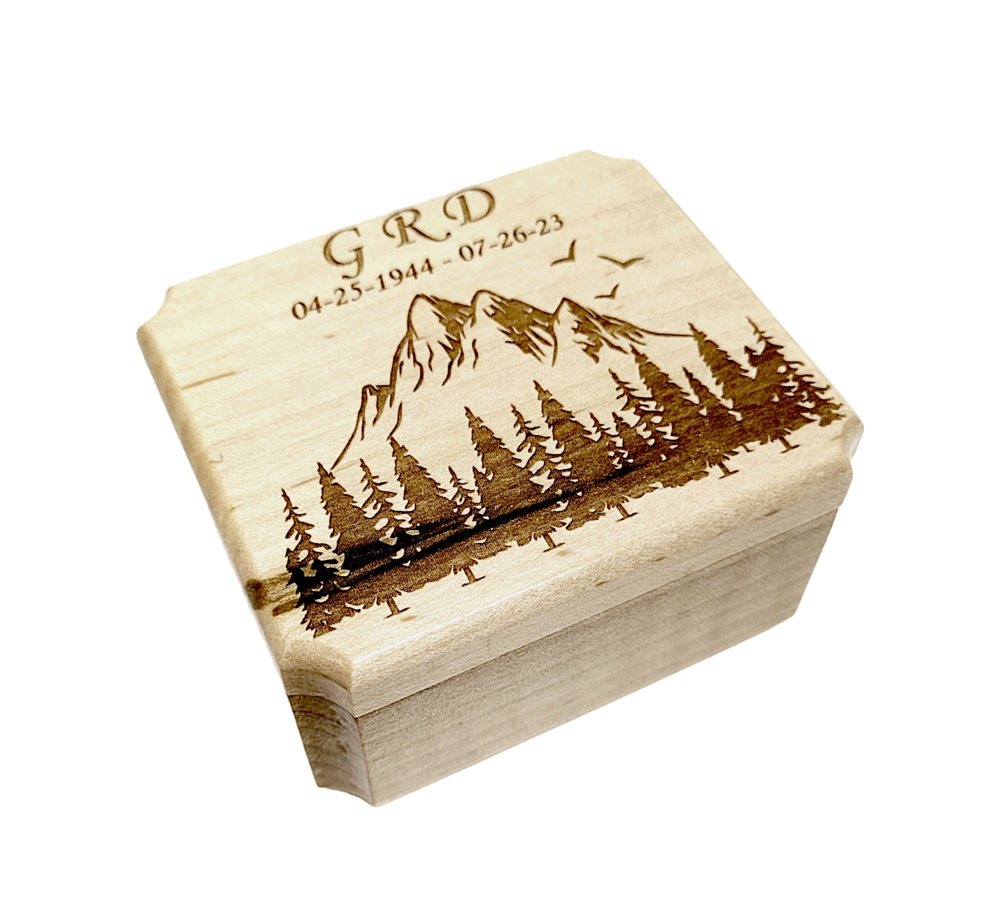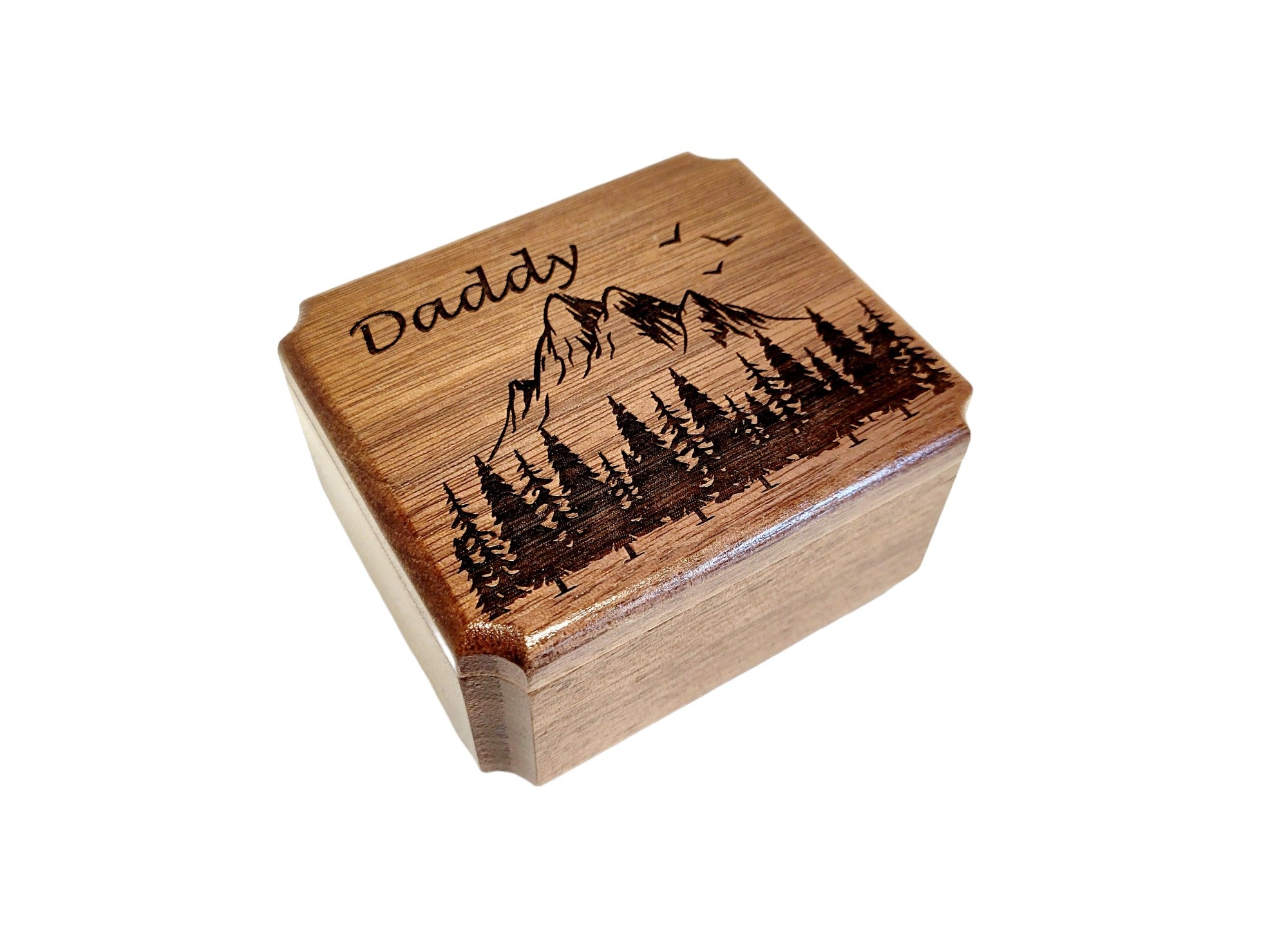 All of our ring boxes are made from premium hardwood, no plywood or pressboard! The design shown in the photos will be engraved along with your custom text. We do not stain or paint any of our urns but apply several finishing coats of lacquer to show off the beautiful natural wood grain.