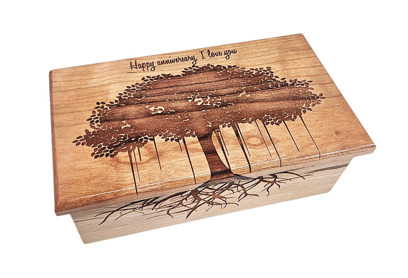 All of our music boxes are made from premium hardwood, no plywood or pressboard! We do not stain or paint any of our music boxes but apply several finishing coats of lacquer to show off the natural wood grain. The design shown in the first listing image will be engraved along with your custom text.