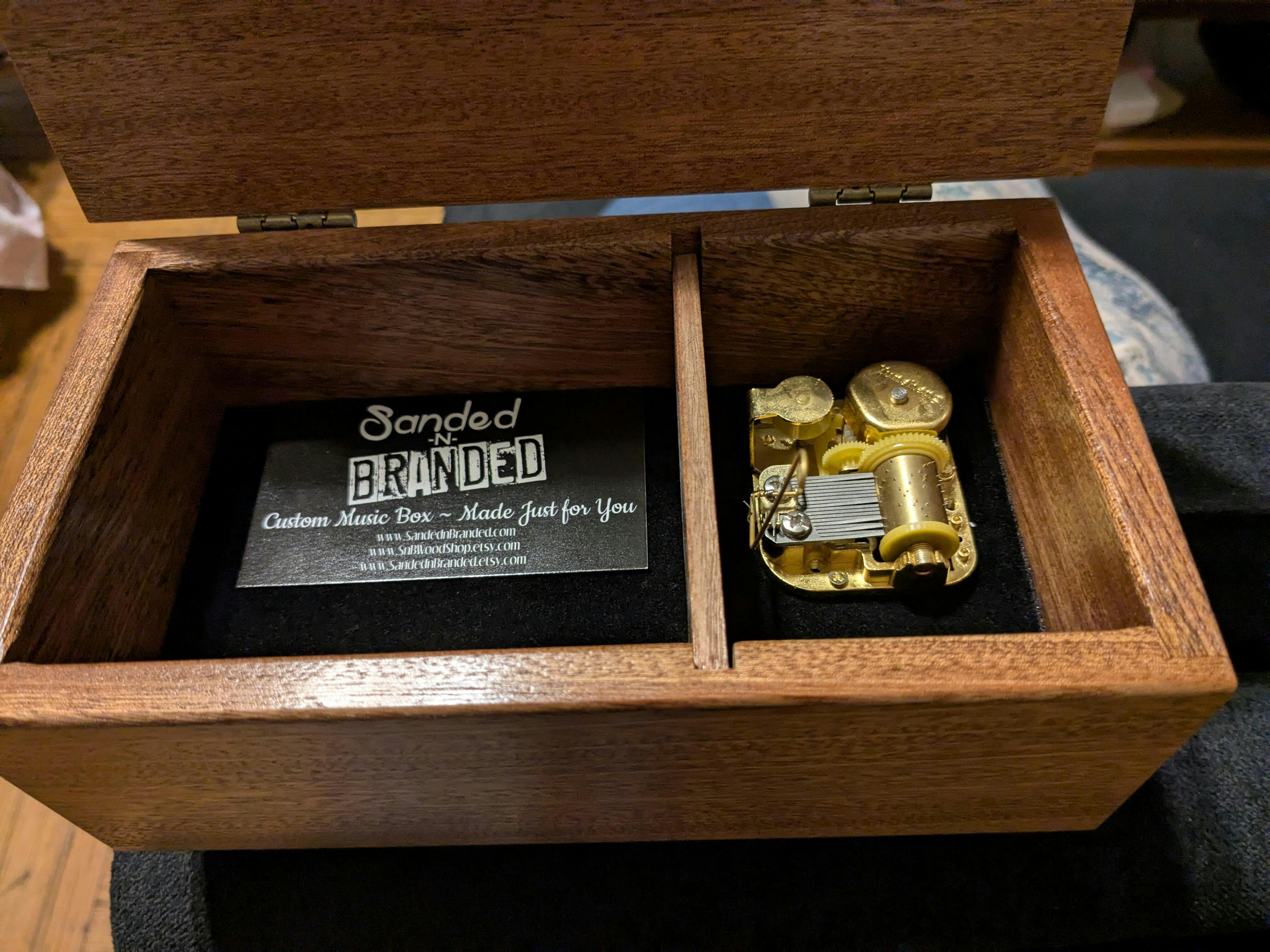We select specific cuts for each music box, but if you have a specific preference, would like a lighter piece of walnut, an ambrosia maple piece with a lot of grain contrast, etc., please note your preference at check out and we will do our best to pick a piece to your request.