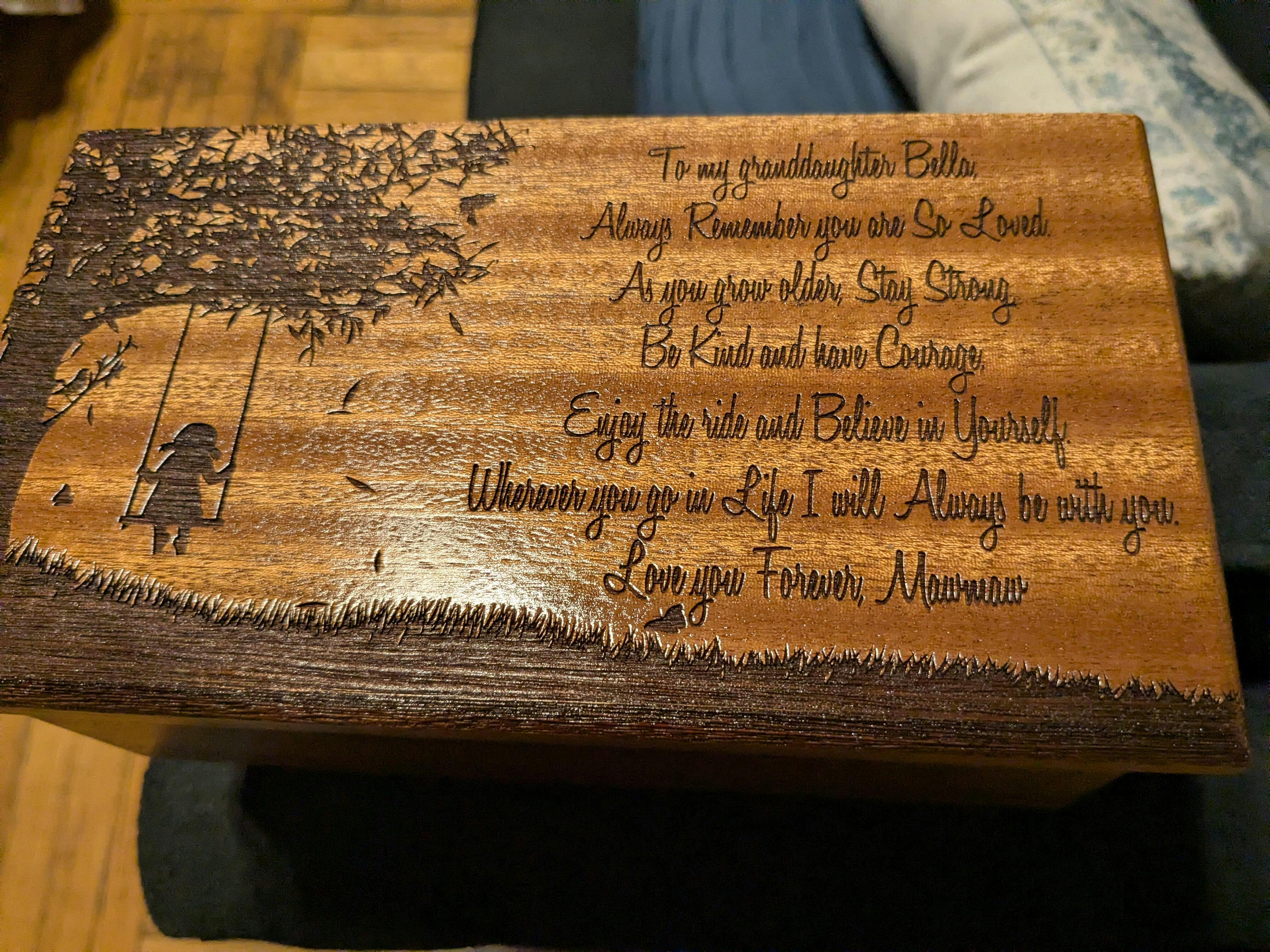 All of our music boxes are made from premium hardwood, no plywood or pressboard! We do not stain or paint any of our music boxes but apply several finishing coats of lacquer to show off the natural wood grain. The design shown in the first listing image will be engraved along with your custom text.