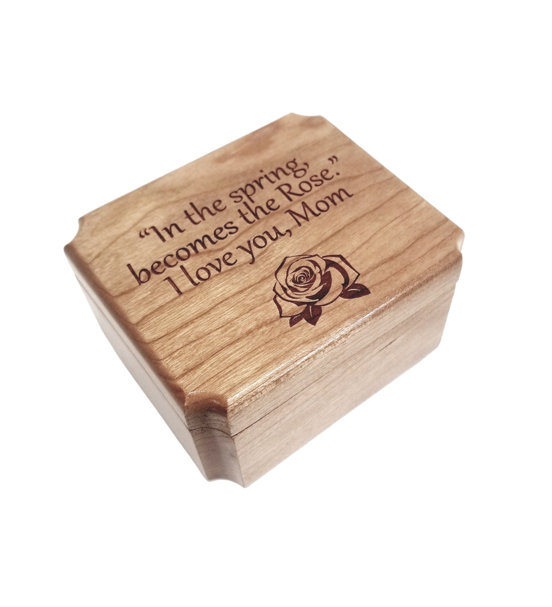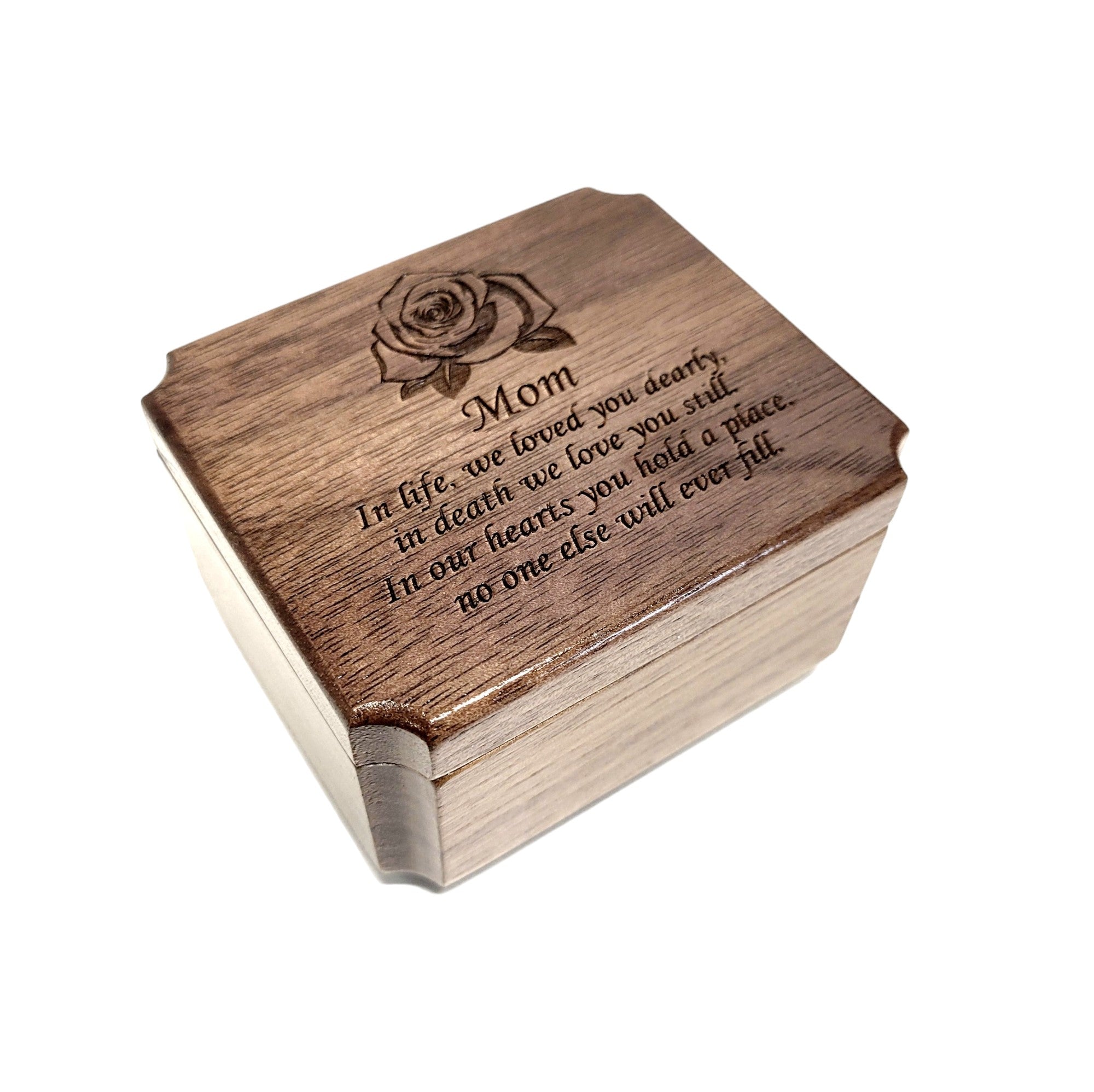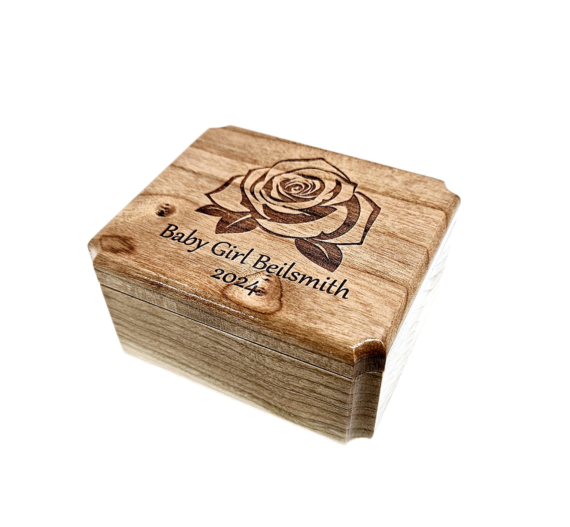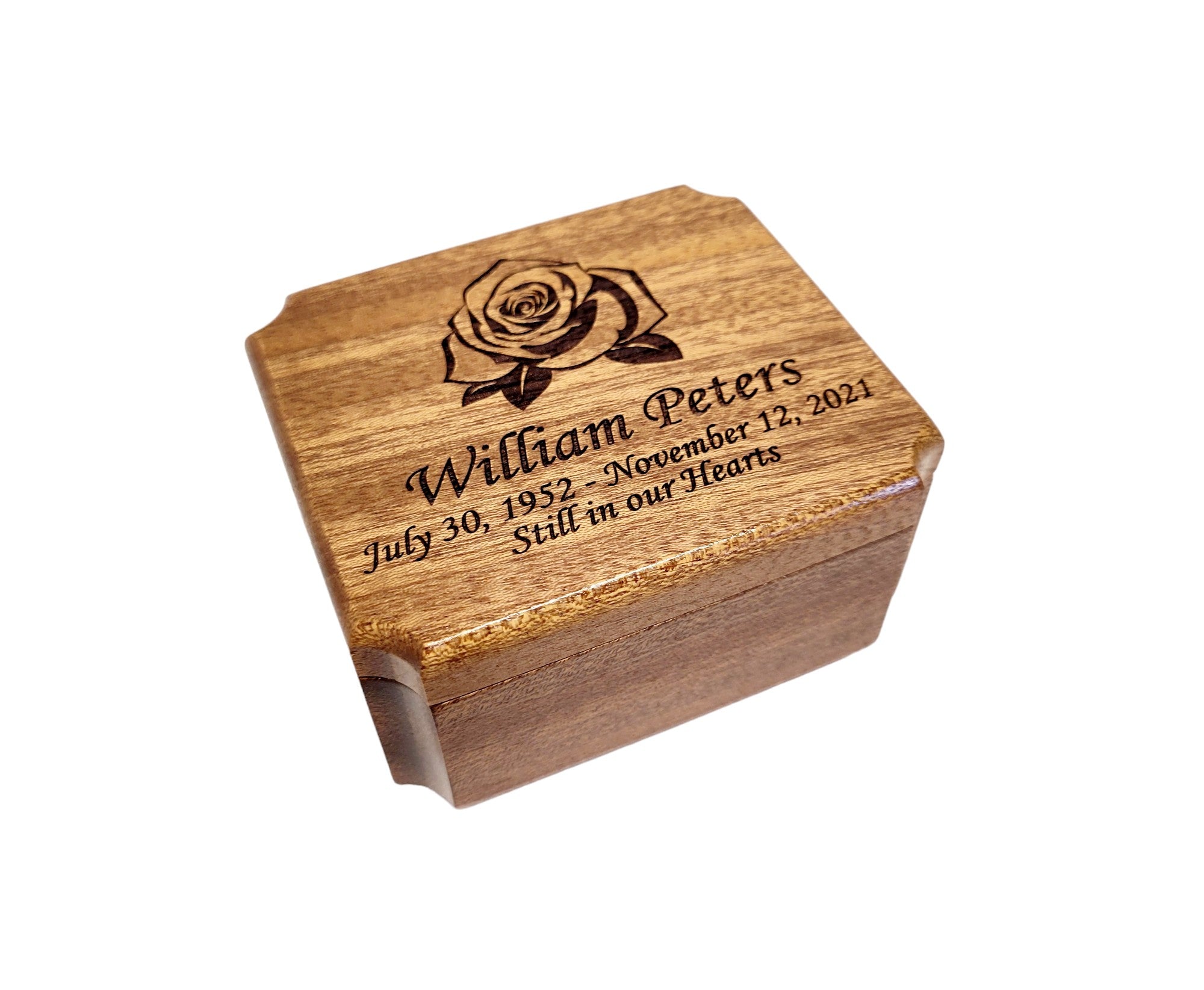 All of our ring boxes are made from premium hardwood, no plywood or pressboard! The design shown in the photos will be engraved along with your custom text. We do not stain or paint any of our urns but apply several finishing coats of lacquer to show off the beautiful natural wood grain.