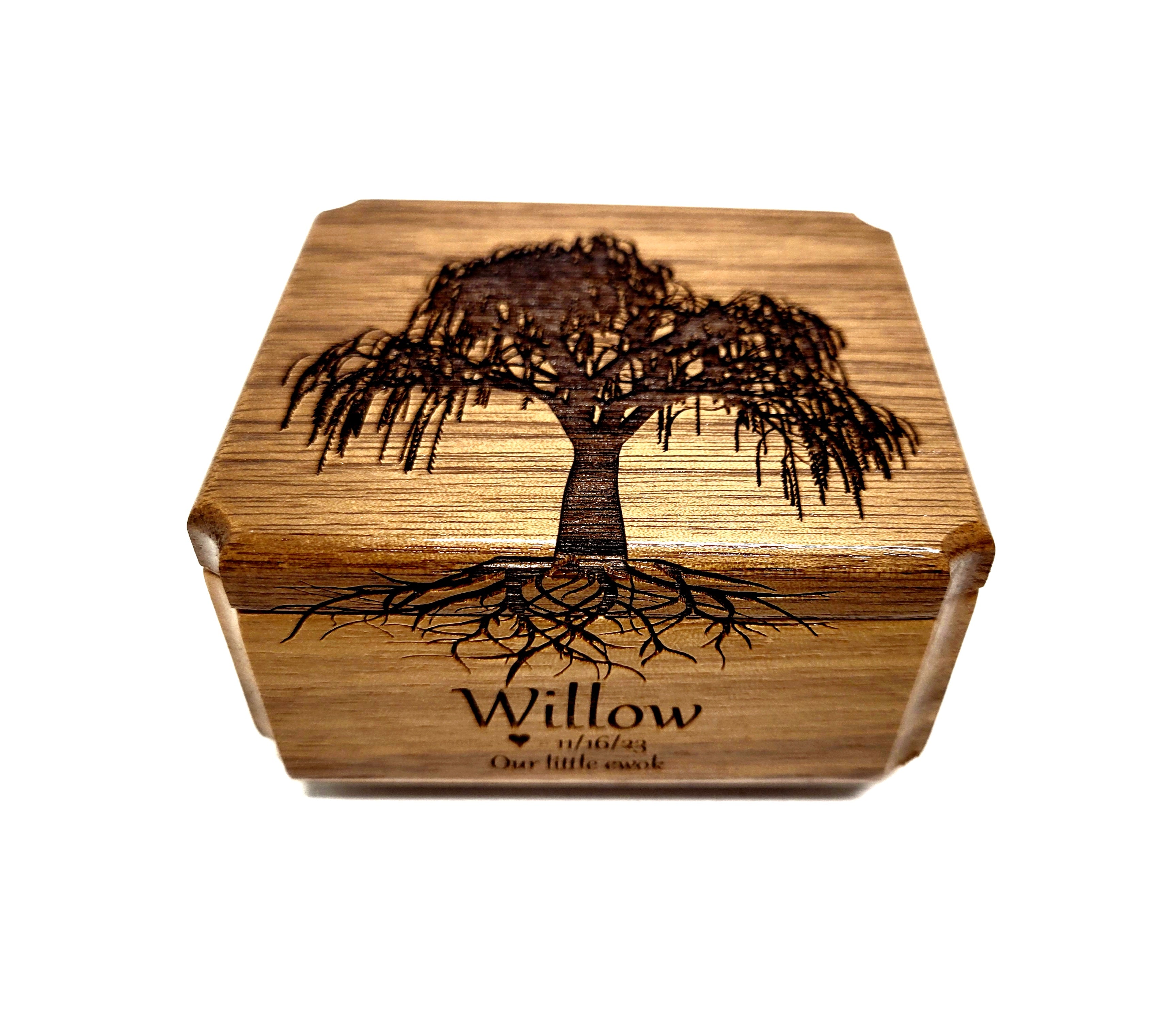 All of our ring boxes are made from premium hardwood, no plywood or pressboard! The design shown in the photos will be engraved along with your custom text. We do not stain or paint any of our urns but apply several finishing coats of lacquer to show off the beautiful natural wood grain.